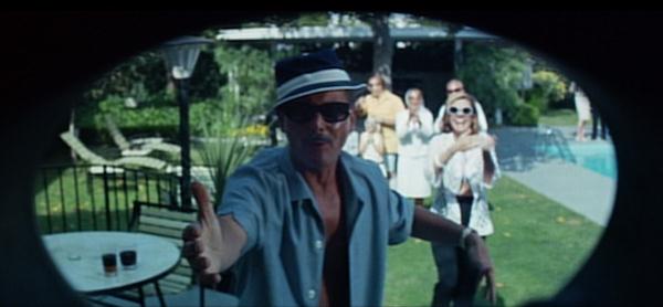 Secondly, on a few occasions the camera adopts Benjamin’s subjectivity, often as a means to demonstrate his claustrophobia in the suburban world of his parents. This is, of course, most notable is the scene in which a reluctant Benjamin is forced to model his new scuba suit for his parents’ friends. For this scene we see the world through Benjamin’s scuba mask – as well as hearing the muffled audio and his breathing. This same sense of claustrophobia is stylistically represented in a different fashion at the first party scene, the welcome home, through the use of very close shots of Benjamin’s face with other faces squeezing their way into the frame.
