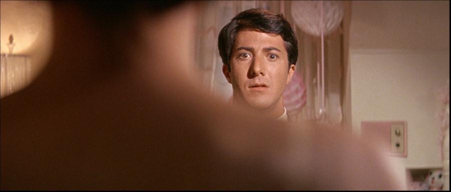 Firstly, consider his positioning in the frame. Early in the film Benjamin is rarely centred in the shot composition. Instead he is largely situated to the right of the screen with expanses of space to his left. It is only later in the film, once he has met Elaine and found a sense of purpose and that his character possesses the conviction to dominate the image.